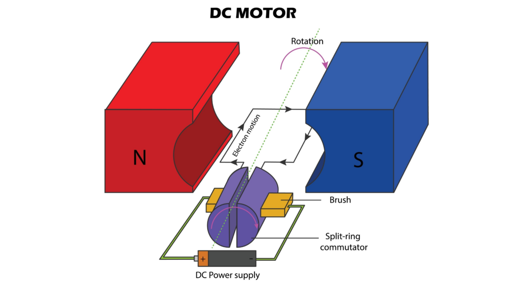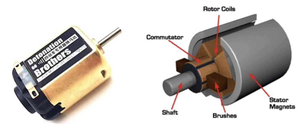 모터는 자석끼리 밀고 당기는 힘을 이용해서 회전 운동을 만듭니다. 보통 하나는 영구자석, 다른 하나는 전류가 흐를 때만 자석이 되는 전자석으로 구성합니다. 중요한 것은 전자석의 극성(N극, S극)을 적절한 타이밍에 바꿔주는 것입니다. 그렇지 않으면 자석끼리 붙어버립니다. 일반적인 DC 모터에서는 극성 바꾸는 역할을 정류자(Commutator)와 브러시(Brush)가 합니다.